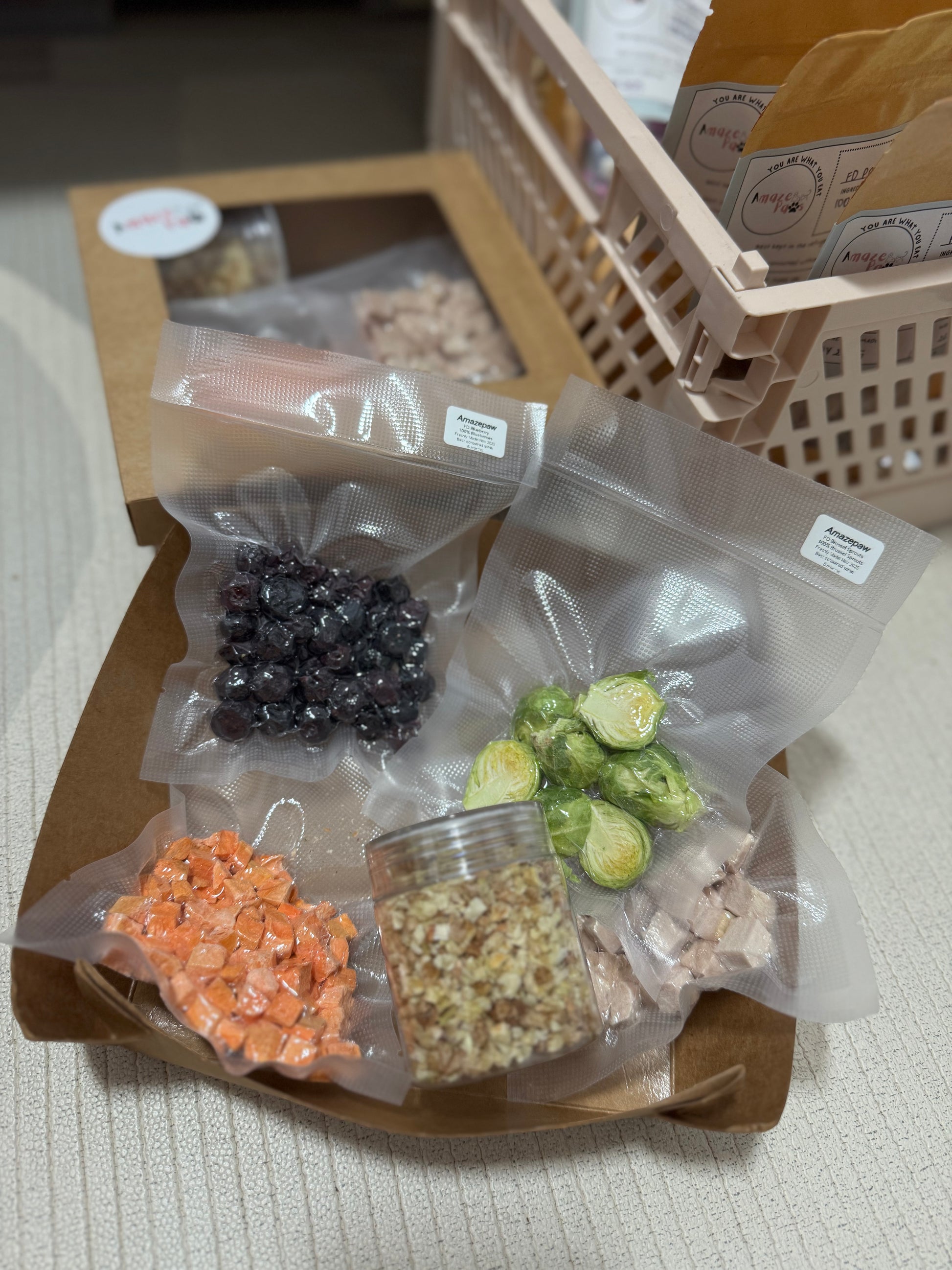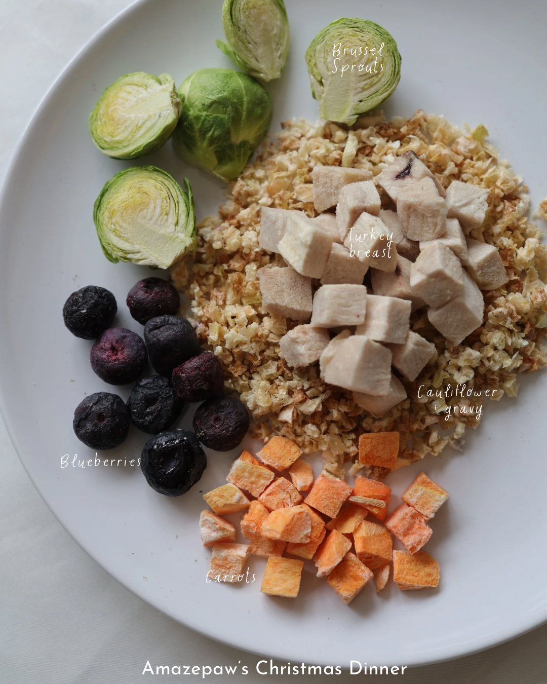 Turkey & Cauliflower Rice and ‘Gravy’ mix 10g each; Blueberry ‘sauce’, and Veggies (Carrots & Brussel Sprouts) 5g each